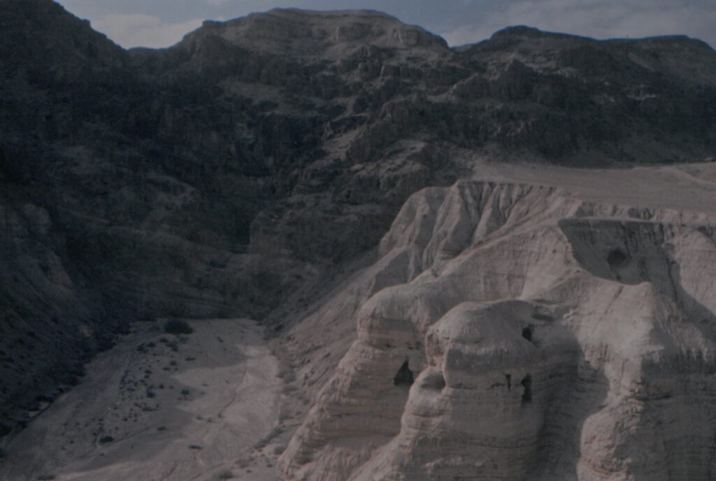 17. Qumran (pictures & display case): The Qumran caves were primarily inhabited by a Jewish sect known as the Essenes from about 150 BCE to 68 CE. Qumran is located approximately 6 miles south of Jericho and 1 mile from the northwestern shore of the Dead Sea. Also pictured is one of the clay pots in which the Dead Sea Scrolls were found. The display case contains scale-sized replicas of various clay pots, and a rock recovered from Qumran.