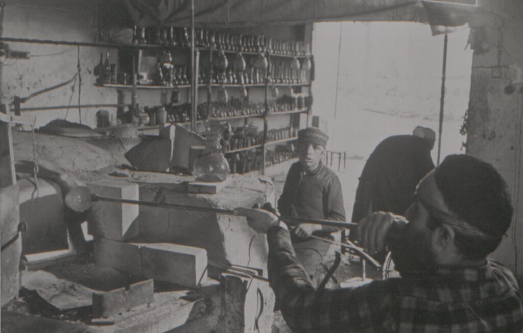 20. Hebron Glass (picture & display case): The picture shows glassmakers practicing their art in Hebron. The display case contains a small pitcher made from blue Hebron glass.