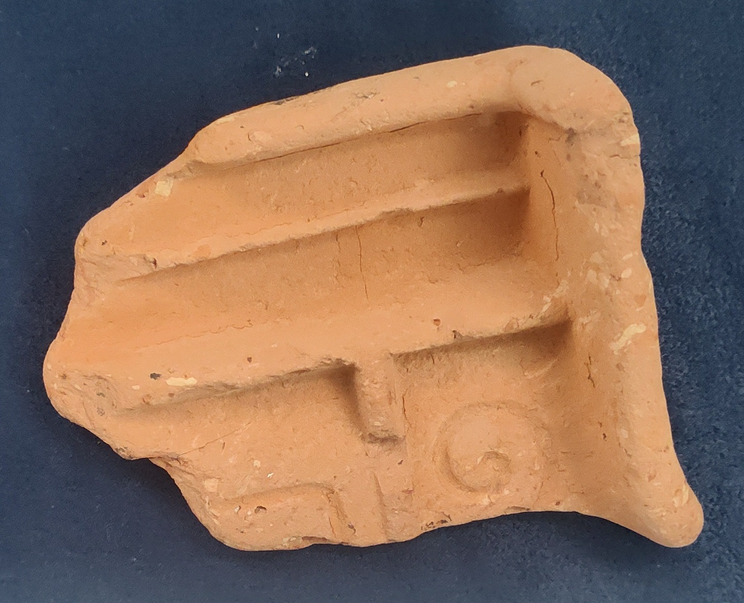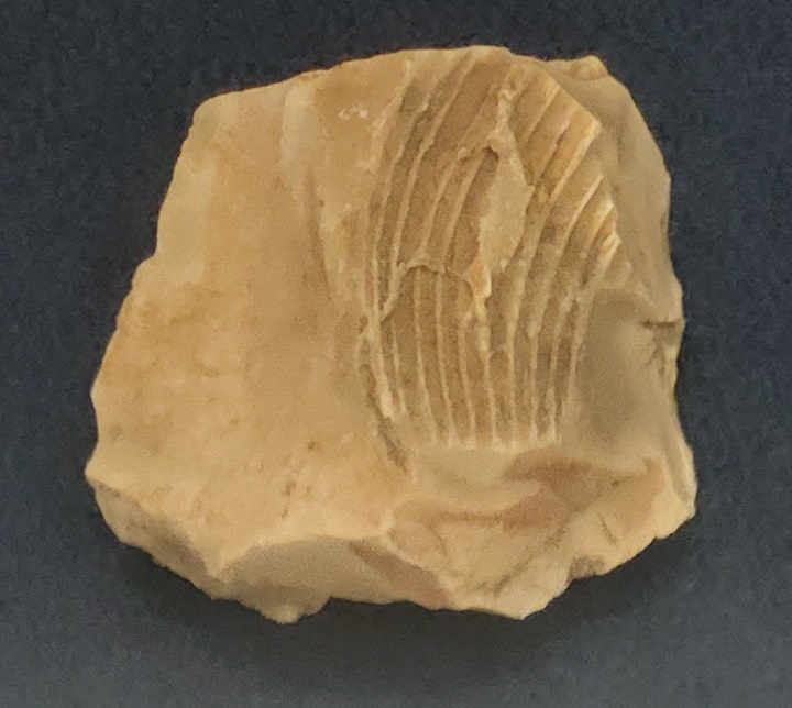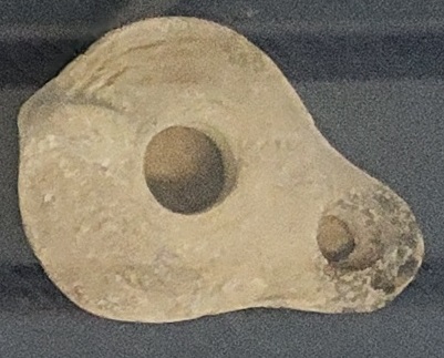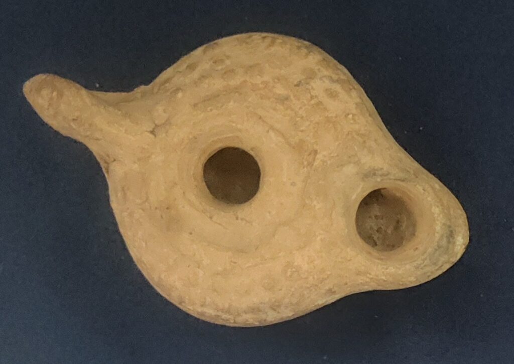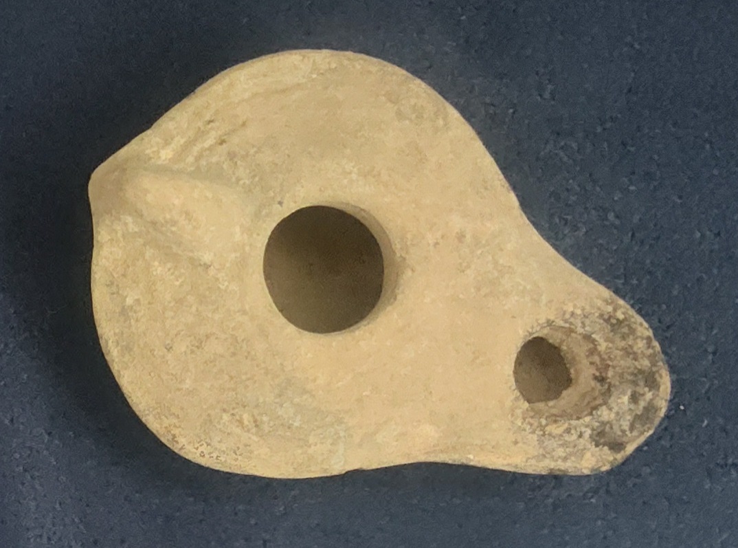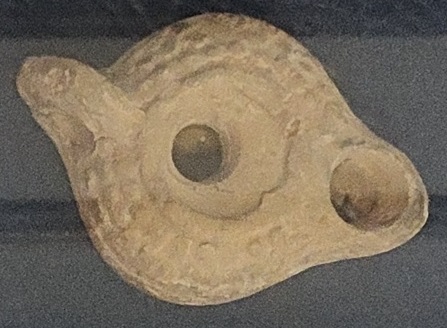 12. Byzantine Oil Lamp, ca. 300 CE (display case only): Prevalent from the 4th to 7th centuries CE, Byzantine oil lamps are characterized by their oval or almond-shape, often with a single nozzle. They differ from the rounder Roman lamps that preceded them. This Byzantine oil lamp is made of clay. Common decorations on clay lamps included menorahs or palm branches.
