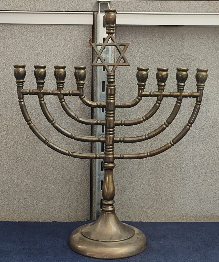 14. Menorah (display case only): A menorah is in the center of the display case. Menorahs are used in many Jewish rituals and celebrations, including the celebration of Hanukkah.