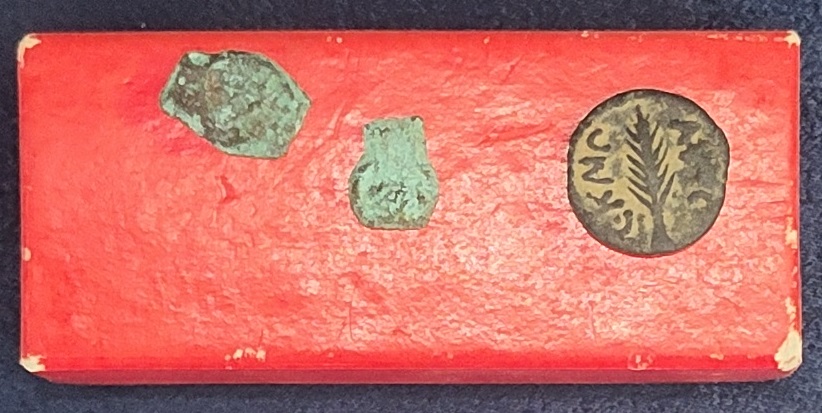 15. Widow’s Mites (display case only): These two small copper coins (mites) are 2,000 years old. They are similar to the mites that Jesus observed a widow donating to the temple treasury in Jerusalem (Mark 12:41-44; Luke 21:1-4).