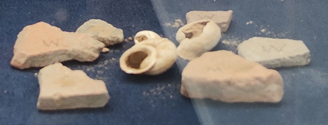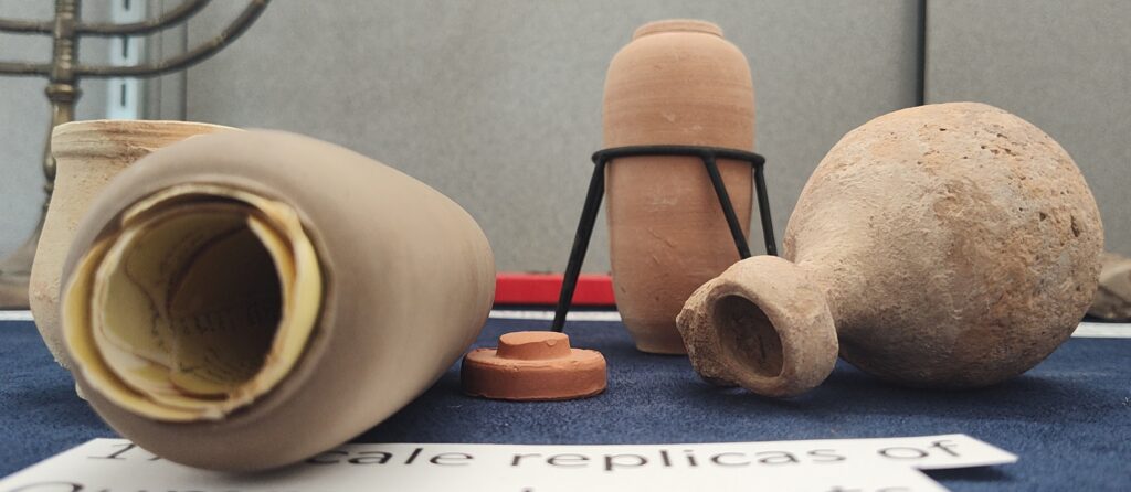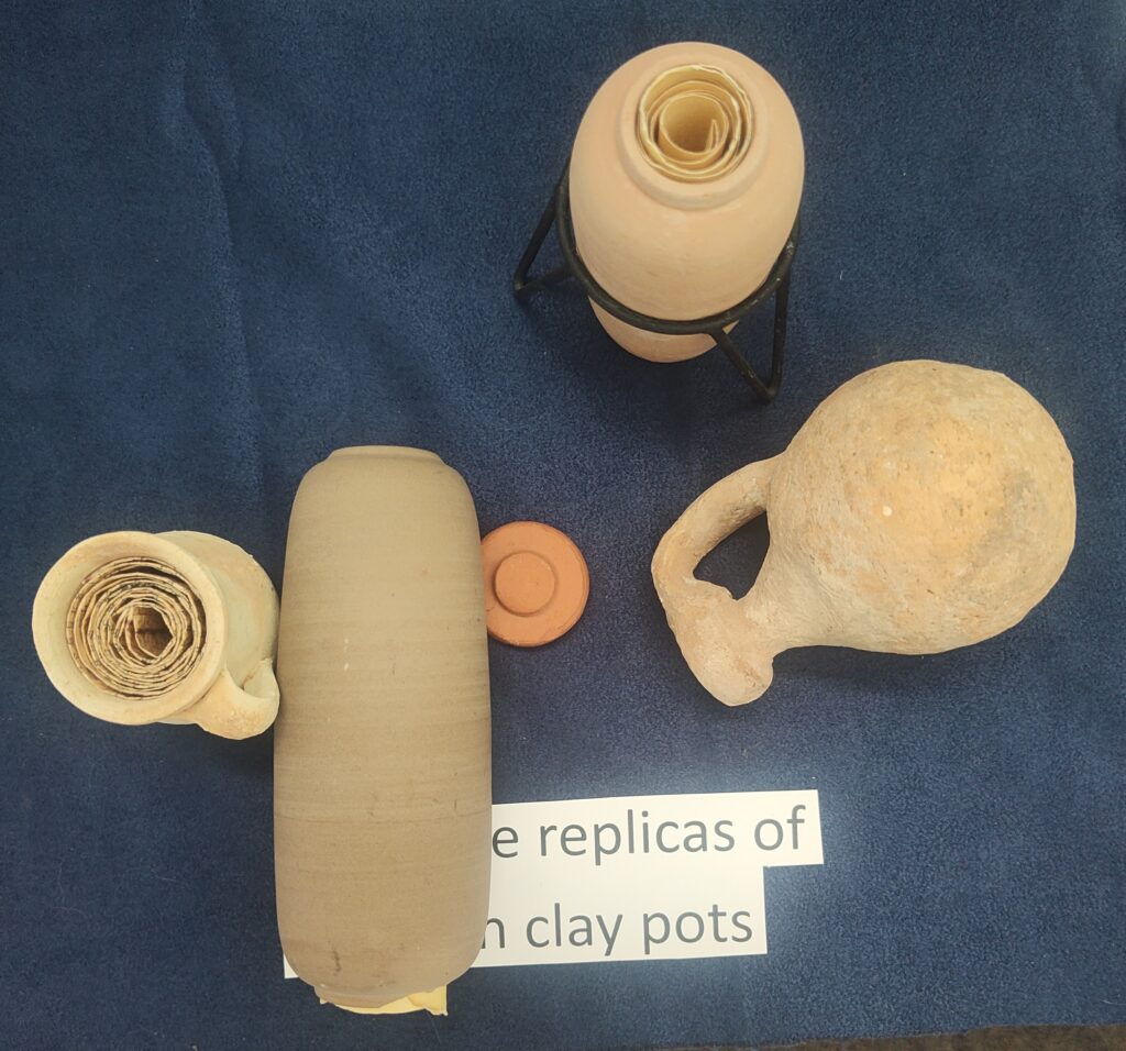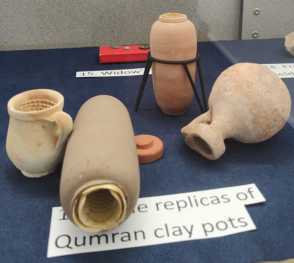 17. Qumran (pictures & display case): The Qumran caves were primarily inhabited by a Jewish sect known as the Essenes from about 150 BCE to 68 CE. Qumran is located approximately 6 miles south of Jericho and 1 mile from the northwestern shore of the Dead Sea. Also pictured is one of the clay pots in which the Dead Sea Scrolls were found. The display case contains scale-sized replicas of various clay pots, and a rock recovered from Qumran.